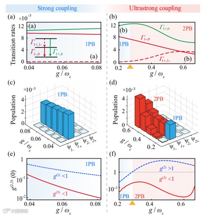 由于USC体系中旋转波近似失效,传统的光子算符已不能准确描述物理过程。该工作采用了基于系统本征态的修正高阶关联函数,从而严格给出了USC中的极化激元统计特性。提出了出现2PB的判据:即必须同时满足双极化激元聚束