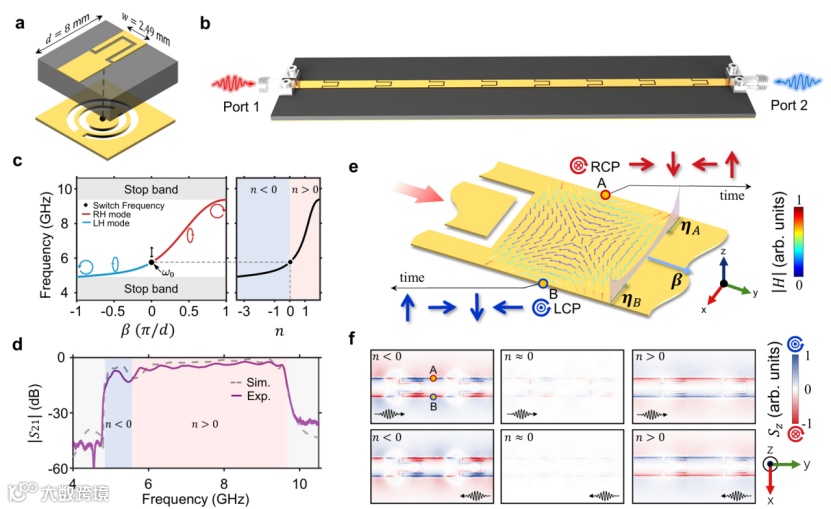 研究团队设计并构建了一种复合左/右手传输线超材料波导(图3a、3b)。测量结果表明,在较低频率通带中系统处于左手传播模式,对应负折射率;在较高频率通带中则进入右手传播模式,对应正折射率。当系统跨越切换频率时,传播常数符号发生改变,有效折射率也随之由负转正。