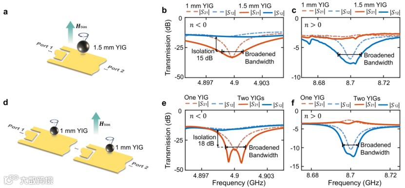 图6|带宽拓展策略。(a)通过增大YIG 体积拓展带宽的器件示意图。(b,c)1.5 mm YIG 球(实线)与1 mm YIG 球(虚线)在左手通带(n<0, b)和右手通带(n>0, c)中的实测传输谱对比。(d)采用两个1 mm YIG 球级联的器件示意图。(e,f)两个YIG 球构型(实线)与单个YIG 球构型(虚线)在左手通带(e)和右手通带(f)中的实测传输谱对比。