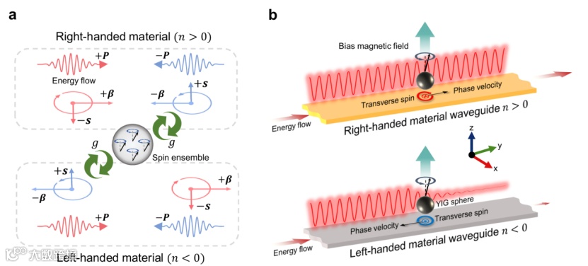 图2|自旋-折射率锁定与光子-磁振子手性耦合示意图。(a) 在正折射率与负折射率体系中,对于固定的能流方向,横向自旋的取向由折射率符号决定,并进一步决定光子与磁振子的手性耦合。(b) 基于复合左右手传输线与YIG 小球的实现方案。折射率符号切换会导致横向自旋翻转,从而实现可重构可切换的光子-磁振子手性耦合与信号传输。