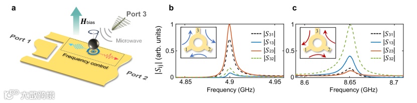 基于自旋-折射率锁定效应,研究团队进一步实现了微波信号的频分路由功能。在三端口复合左右手传输线–YIG器件中,在端口3通过天线激发磁振子(图5a)。当工作频率位于约4.9 GHz 的左手频带(n<0)时,信号在三个端口之间形成1→3→2→1 的循环路径;当频率调至约8.65 GHz 的右手频带(n>0)时,信号传播方向整体反转,在端口之间形成1→2→3→1 的循环路径。由此,通过改变工作频率即可切换信号在不同端口之间的传播路径,实现基于自旋–折射率锁定机制的频分信号路由。关注来自3端口的传输信号,高频和低频信号可分别被分发到1或者2端口,实现频分微波漏斗功能。