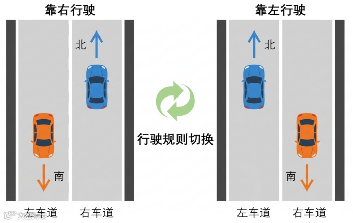 但如果道路规则从“靠右行驶”切换为“靠左行驶”,情况就会变得不同。车辆仍然沿原来的方向前进,但会被分配到另一侧车道。也就是说,改变的不是前进方向,而是前进方向与车道之间的对应关系。