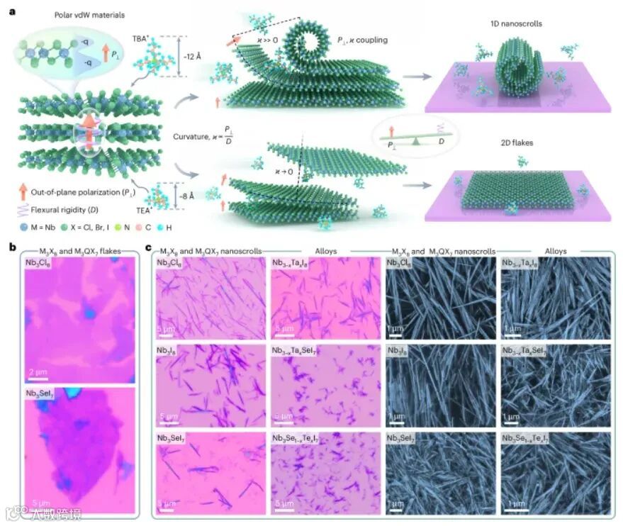 图 1:插层介导的几何工程,用于可控合成极性 vdW 材料的 1D 纳米卷和 2D 薄片(图源自