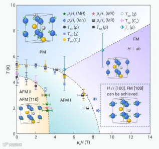 电学、磁学和比热的测量结果揭示了EuAgBi中的各种磁转变。EuAgBi在零场下存在两个反铁磁转变(TN1 ≈ 5.3 K,TN2 ≈ 4.5 K),随着磁场的增强,反铁磁转变逐渐向低温移动。当磁场达到8 T以上时,出现场诱导的铁磁转变。MH曲线表明易磁化轴位于ab面内。综合所有的测试结果,绘制出了EuAgBi的磁相图(图3)。