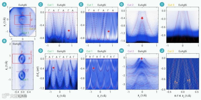 角分辨光电子能谱(ARPES)实验证实了理论预测的结果。沿Γ–A方向测得的周期能带与计算结果高度一致。在EuAgBi和BaAgBi中均观察到清晰的狄拉克点,前者为非中心对称(图5C和E中红色箭头),后者为中心对称(图5D和F中红色箭头)。非中心对称狄拉克点位于(0, 0, ±0.63π/c),位置更靠近A点,导致其在ARPES谱图中成对出现。垂直于Γ-Z路径过狄拉克点的能带切面(cut 2)从侧面展示了狄拉克点的位置(图5G和H)。在P破缺的EuAgBi中,形成了四条非简并能带(构成狄拉克点的能带发生分裂;图5G),这与BaAgBi中的两条二重简并能带形成鲜明对比(图5H)。尽管这四条能带因为过于接近而难以被完全分辨,但P破缺诱导的沿K-Γ方向的能带劈裂仍然可辨:短(长)黄色箭头标记了由Γ-A的DT8二重简并能带分裂产生的非简并LD4(LD3)能带(图5I和J)。这些结果从实验上证明了非中心对称狄拉克点的存在,也验证了HSE06杂化泛函在修正能带计算中的重要作用。