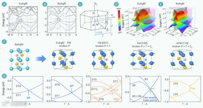 第一性原理计算揭示了EuAgBi磁结构与能带拓扑的耦合关系。能量最低的AFM [110]为可能的基态,其磁矩位于ab面内。对于具有反演对称性的BaAgBi,由于P和T的共同保护,所有的能带均保持二重简并(图4B),在Γ–A方向形成中心对称的狄拉克点;而在P破缺的顺磁态EuAgBi中,只有受到C₆保护的Γ–A方向的能带仍保持二重简并(图4A),形成非中心对称的狄拉克点。这表明P并非狄拉克点存在的必要条件。当外加磁场使得磁化完全饱和,形成场诱导的铁磁态FM [001]时,P与T同时破缺,狄拉克点分裂为四个外尔点(图4G);当形成FM [100]时,P、T和C₆对称性被完全破坏,能带产生近三重简并点。