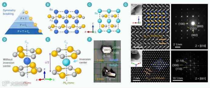 采用高温助熔剂法成功生长出高质量的EuAgBi和BaAgBi单晶。通过X射线单晶衍射数据进行结构解析,发现EuAgBi的晶体结构(CCDC编号:2419060)属于非中心对称空间群P63mc,其中Ag和Bi原子沿c轴具有明显的上下起伏,导致反演对称性缺失。高角度环形暗场扫描透射电镜结果进一步证实了这一结构特征(图2G)。对比已知的BaAgBi结构,虽然两者具有相似的元素组成和六方蜂窝结构,但在对称性上存在根本差异。BaAgBi中的Ag和Bi原子位于同一平面,反演中心位于Ba原子的位置,而EuAgBi中Ag和Bi原子的上下起伏破坏了这一对称性。这一结果使得EuAgBi和BaAgBi成为研究P破缺影响的理想体系。