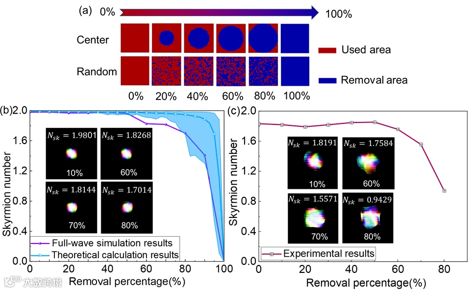 团队进一步进行极端鲁棒性测试:随机移除超表面单元,并统计斯格明子数变化。