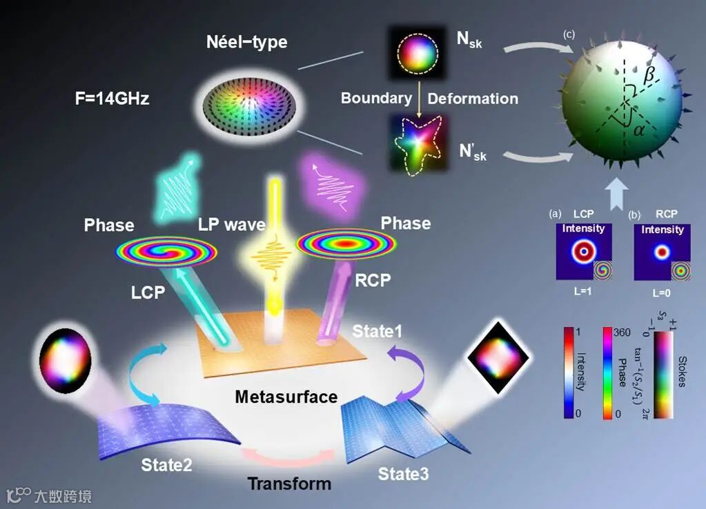 图 1:用于生成微波频段斯格明子的共形超表面。当自由形态超表面从平面结构(状态 1)转换为圆柱形(状态 2)或三角形(状态 3)时,在线性偏振电磁波的入射作用下,斯格明子从圆形变为椭圆形或菱形。随着s斯格明子边界的变形,其拓扑数保持不变。所有这些结构在生成斯托克斯斯格明子时都表现出很强的鲁棒性。(a)和 (b)分别是 LCP 波和RCP 波的电场强度,(c) 显示的是 Poincaré 球表面上的三维斯托克斯矢量及其在横向平面上的立体投影。