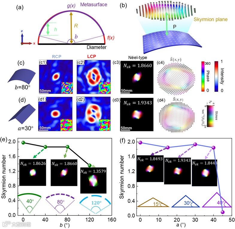 图2:(a) 超表面弯曲的示意图。(b) 斯格明子生成示意图。(c) 显示了b=80° 时Nsk= 2 斯格明子的振幅、相位和斯托克斯矢量纹理图,(d) 显示了a=30° 的三角形结构。(e)和(f)显示了在不同几何参数a和b条件下,由圆柱形和三角结构共形超表面产生的斯格明子数和相应的斯托克斯纹理。