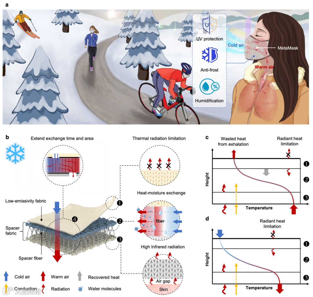 尽管寒冷气候常常被全球变暖事件所掩盖,但由“暖北极-冷大陆”模式驱动的北半球前所未有的寒流可能会成为对全球公共卫生的重大且被低估的威胁。在寒冷环境下,佩戴面罩是预防呼吸道疾病的关键手段之一,但其应用始终面临的核心挑战是:如何在保障充足氧气摄入的同时,维持面部微环境的热湿舒适性。此问题的关键在于,呼吸过程中产生的强制对流会显著破坏口罩与面部间的静态热湿平衡,降低面罩的热交换效率,导致传统面罩难以兼顾 “热湿调控”与“呼吸通畅”的需求。