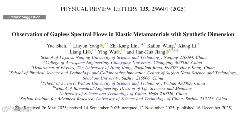 近日,南京理工大学吴迎副教授、黎亮教授联合中国科学技术大学蒋建华教授首次使用合成维度方法实现了弹性超材料中无能隙谱流的观测。相关工作以Observation of Gapless Spectral Flows in Elastic Metamaterials with Synthetic Dimension为题发表于物理学顶级期刊《物理评论快报》(Physical Review Letters)上,并入选了“编辑推荐”。南京理工大学的硕士生沈悦为本文的第一作者,重庆大学杨林运副教授和香港大学博士后林志康博士为论文共同第一作者,吴迎、黎亮和蒋建华为论文的共同通讯作者。此外,南京理工大学硕士研究生王凯伦和武汉科技大学李响副教授也做出了重要贡献。