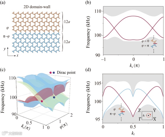 为了研究合成表面布里渊区中的表面色散,研究团队构建了由一对手性相反的弹性拓扑绝缘体(即盲孔方向相反)构成的二维“畴壁”结构。引入