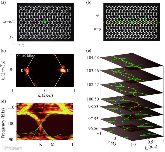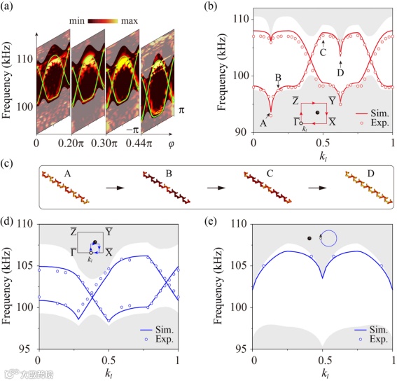 值的二维弹性超材料表面的位移与相位分布,再对其进行傅里叶变换,得到了不同样品在动量空间中的色散曲线。在