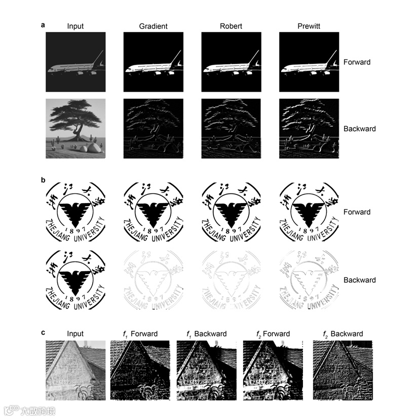 实验结果表明,该网络在宽带范围内实现了双向独立的图像处理,并能够根据输入信号的编码灵活加载算子(见图4)。在前向路径中,网络完成了图像对比度增强,模拟生物神经网络的全局感知;在后向路径中,网络则执行了边缘检测,模拟生物神经网络的局部响应。这种在单一结构中的“感知—响应”解耦的类脑特性,有效避免了外部方向选择模块的使用,降低了系统复杂度。