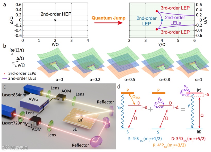 图1 (a)量子跳跃导致的哈密顿量奇异点到刘维尔奇异点的变化;(b)刘维尔奇异点随混合参数α的变化趋势总览;(c)囚禁离子实验系统示意图;(d)在三能级系统中可控能量耗散和退相的架构。