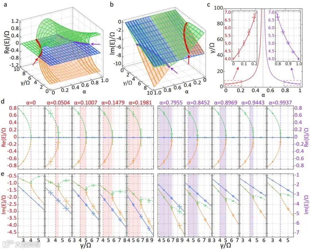 上述奇异点在参数空间的移动源于退相和能量耗散对应的两类刘维尔算子之间的非对易。同时,图2(e)表明该杂化刘维尔奇异点对应二阶刘维尔奇异点。其依据为本征能量的对应的有效耗散仅有两条曲线发生了简并和分叉(图2(e))。