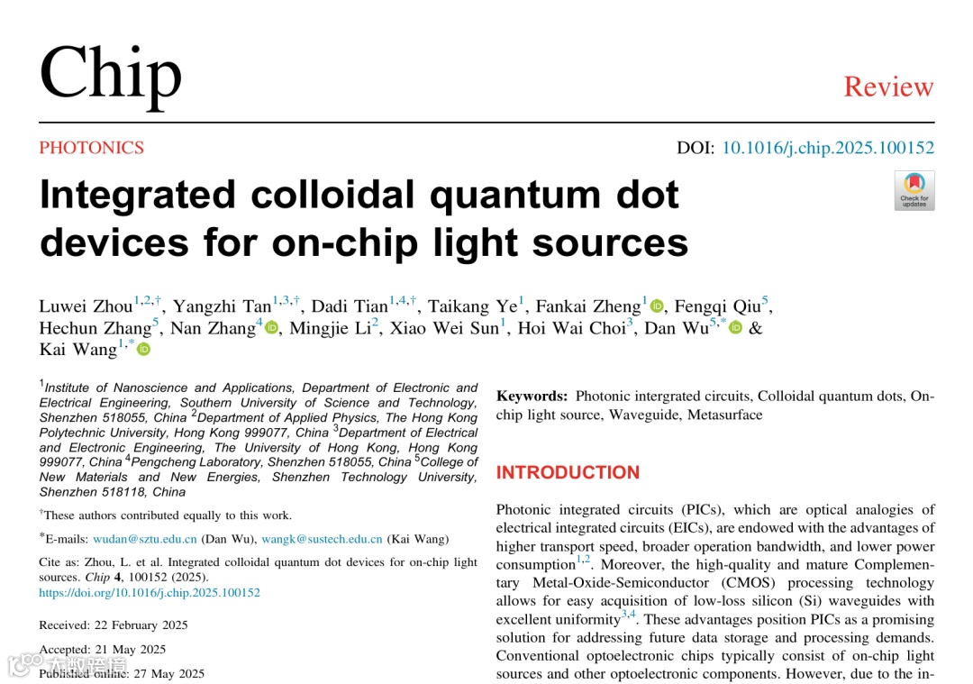 近日,南方科技大学王恺团队和深圳技术大学吴丹团队以「Integrated colloidal quantum dot devices for on-chip light sources」¹为题在Chip上发表长篇综述论文,对胶体量子点光源在集成光子器件上的发展进行了总结,并围绕朝向电泵浦胶体量子点激光器的最终应用做出了展望。共同第一作者为周禄为、谭扬志和田大地,通讯作者为王恺和吴丹。