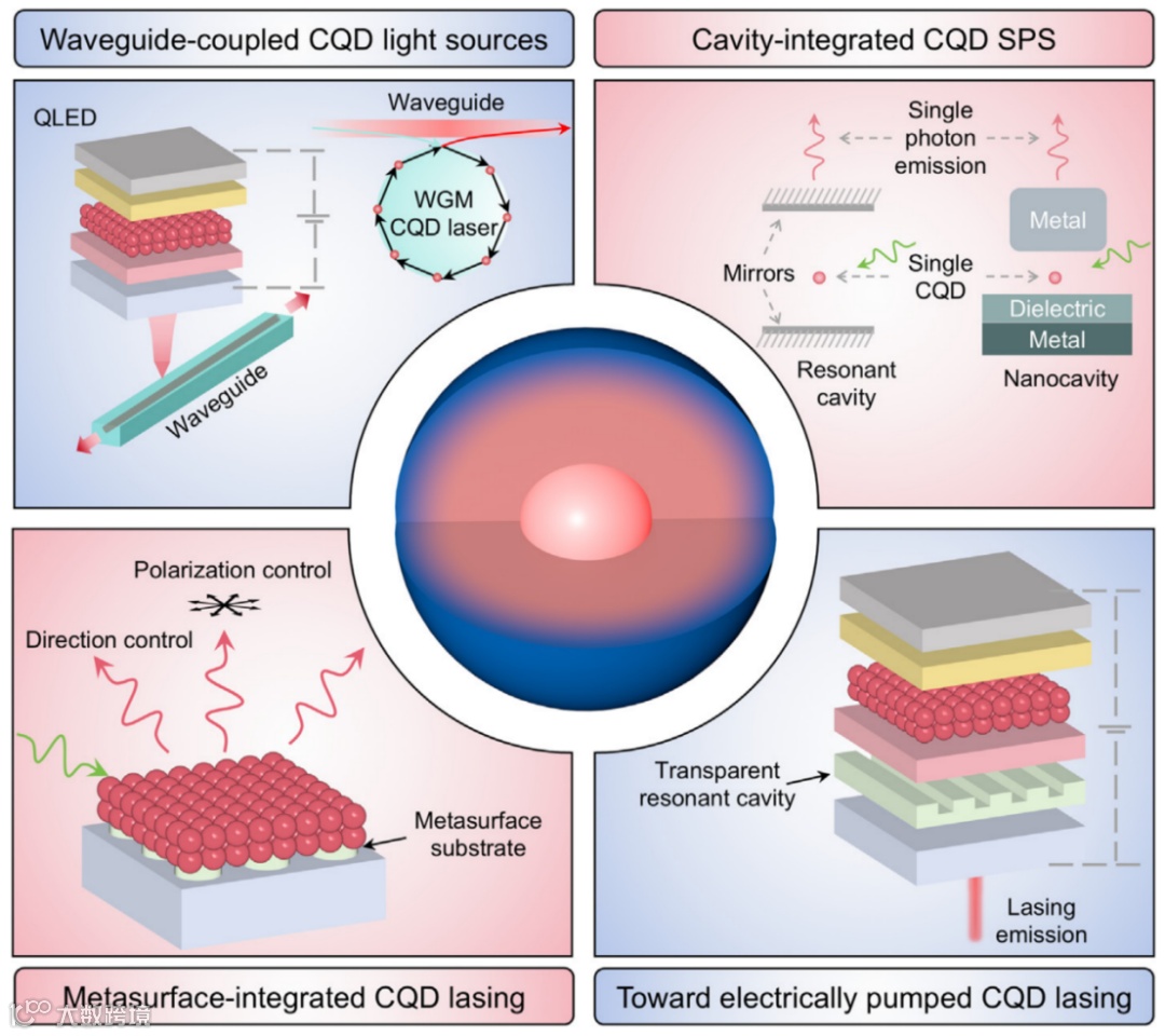 This review begins with the structural evolution of CQDs, outlining their development from early discrete core–shell structures to alloyed gradient structures2. While discrete core–shell structures suffer from numerous interfacial defects and rapid carrier Auger recombination, which limit their optical performance, the introduction of compositionally graded alloy structures has effectively suppressed non-radiative recombination caused by defects and Auger processes in CQDs. This advancement has significantly enhanced both spontaneous and stimulated emission performance of CQDs, leading to notable improvements in CQD light-emitting diodes (QLEDs) and laser devices. Building on these material advances, this article systematically reviews key applications of CQDs in integrated photonic devices (Fig. 1), including: (1) waveguide-coupled CQD light sources; (2) metasurface-integrated CQD lasers; (3) optical cavity-integrated CQD single-photon sources; and (4) integrated device designs toward electrically pumped CQD lasers.