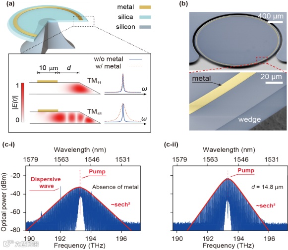 图1. 金属修饰的二氧化硅微盘腔光场特性、SEM图像、生成的孤子光频梳 (a) 金属修饰的二氧化硅微盘腔示意图,插图为微盘腔横截面中基模与高阶模式的光场分布,以及有无金属情况下对应模式线宽对比。d代表金属环与与楔角上边缘之间的间隙。(b)金属修饰微腔的电子显微镜图像,黄色条带部分为修饰用的金属圆环。(c)不同微腔中产生的孤子光频梳光谱。 I为未经过金属修饰的微腔产生的孤子光频梳,ii为经过金属修饰的微腔产生的孤子光频梳。