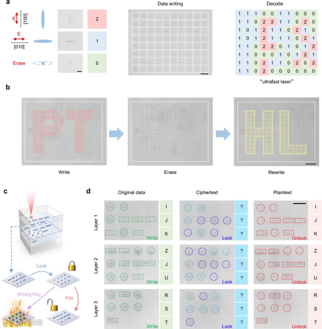 通过控制激光写入参数,可以灵活调控位错形成区的取向、长度和形貌。值得注意的是,位错写入和擦除的工艺窗口具有显著区别,为调控位错提供了丰富的参数集。利用位错的可控写入和擦除特性,激光辐照区域天然地呈现出三种基本状态:位错擦除、[100]取向位错分布和[010]取向位错分布,这支持多维度信息复用(图4)。利用位错写入窗口和擦除窗口的差异性还可实现非对称物理加密,当在晶体中写入信息后,可以通过特定参数(公钥)按需擦除原始数据,将其编辑为密文,读取数据时,可以使用另一组重写参数(私钥)解码密文,理论上,公钥和私钥的组合是无限的,并且可以任意扩展。重要的是,如果使用了错误的参数密钥,密文将在解密过程中自动销毁且无法恢复,从而永久阻止破解攻击。