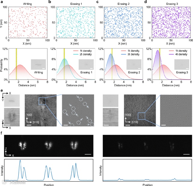 ABO3钙钛矿氧化物中位错具有高度稳定性,在晶格结构和铁电畴环境下表现出低迁移率,这使得位错写入通常是不可逆的。位错湮灭本质上是互补位错相遇引起的,当两个具有相反伯格斯矢量的位错间距小于临界湮灭距离 (~1.5–1.6 nm)时,它们的应力场叠加并部分抵消。超快激光诱导的位错密度极高(~1016 m-2),初始位错平均间距小于4 nm。通过原位激光二次辐照能够在先前形成的位错区域内显著增加位错密度,使其平均间距低于临界湮灭距离,从而实现位错擦除。实验中,当二次辐照时间超过位错诱导时间的两倍时,位错形成区明显缩短,由各向异性的长条状变为焦点中心的各向同性点,位错几乎被完全擦除(图3)。