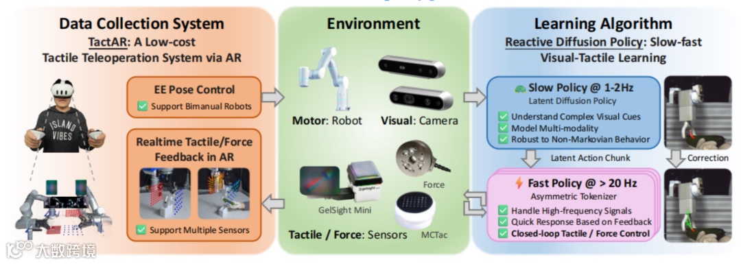 日前,相关论文以《Reactive Diffusion Policy:面向接触密集型操作的快慢视觉-触觉策略学习》(Reactive Diffusion Policy: Slow-Fast Visual-Tactile Policy Learning for Contact-Rich Manipulation)为题发表在预印本网站 arXiv[1],并入围机器人顶会 RSS 2025(Robotics: Science and Systems)最佳学生论文提名。