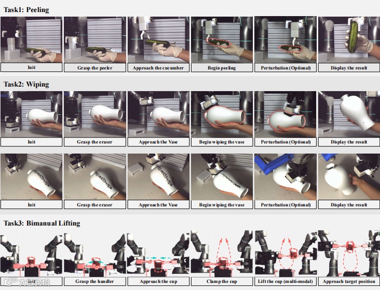 图丨三项实验任务,包括削皮、擦花瓶和双臂抬升(来源:arXiv)