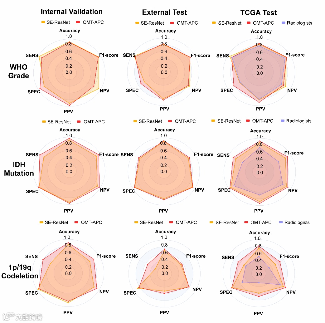 该模型不仅在分割精度上表现优异,即病灶区域精度达95%以上,还在多项遗传标志物预测任务中取得突破——在TCGA标准测试集上,IDH突变预测准确率达91.7%,1p/19q共缺失预测准确率为80.9%,均显著优于现有模型及人类专家水平。