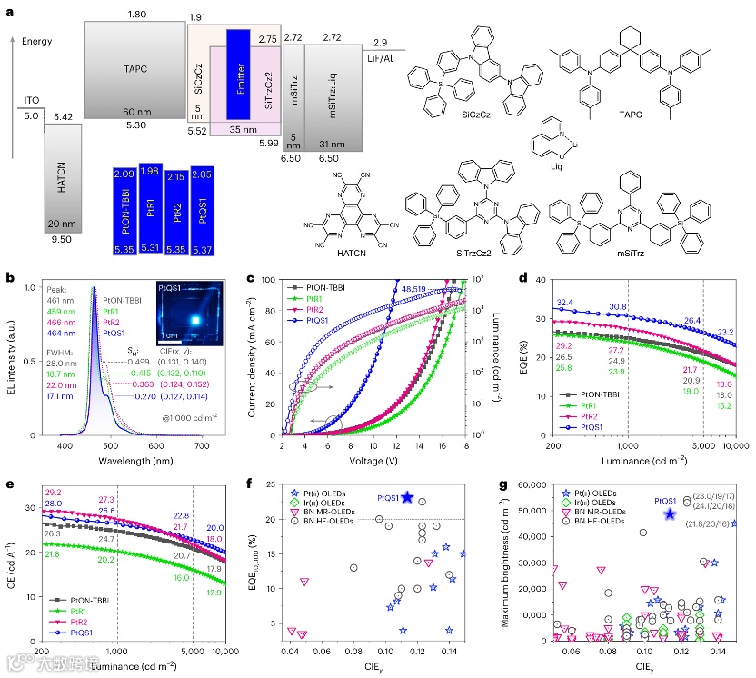 图4a的器件结构显示PtQS1发光层能级(2.72 eV)低于主体材料激基复合物(2.84 eV),确保高效能量转移。图4b中PtQS1器件电致发光(EL)光谱峰值464 nm,FWHM保持17.1 nm,CIE*y*=0.114,且无激基复合物发射,证明三维结构成功抑制分子相互作用。图4d-e显示其EQE在1000 cd m⁻²下达30.8%,远超参照组(PtON-TBBI仅23.9%),且在10000 cd m⁻²高亮度下仍维持23.2%。图4f-g的散点图表明,PtQS1在CIE*y*<0.15的深蓝光OLED中兼具最高效率(EQE)与最大亮度(48,519 cd m⁻²),综合性能领先于铱(III)配合物及多共振热激活延迟荧光材料。