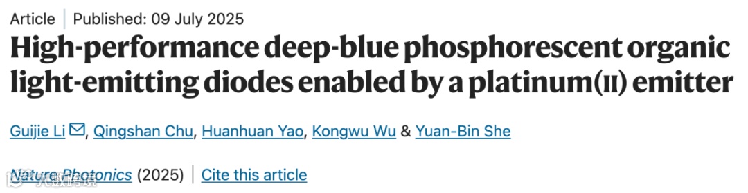 1.首创窄谱深蓝光发射:设计三维刚性铂(II)配合物 PtQS1,实现室温下17.1 nm的半峰宽(FWHM),为迄今报道最窄的铂基蓝光发射光谱。