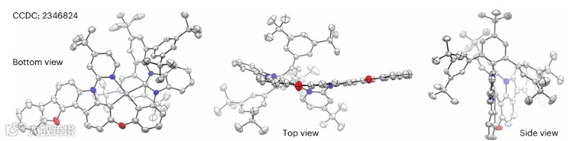 单晶X射线衍射(图2)直接验证了PtQS1的三维空间构型。4-叔丁基苯基平面与N-杂环卡宾(NHC)平面近乎垂直(夹角≈90°),且3,5-二叔丁基苯基基团迫使分子呈现非平面构型。晶体堆积结构显示无π-π堆叠现象,与传统铂配合物普遍存在的分子间作用形成鲜明对比。这种刚性构象不仅提升热稳定性(热失重5%温度达473°C),更从根本上避免了因堆叠引起的光谱红移与效率损失,为器件的高色纯度与稳定性奠定结构基础。