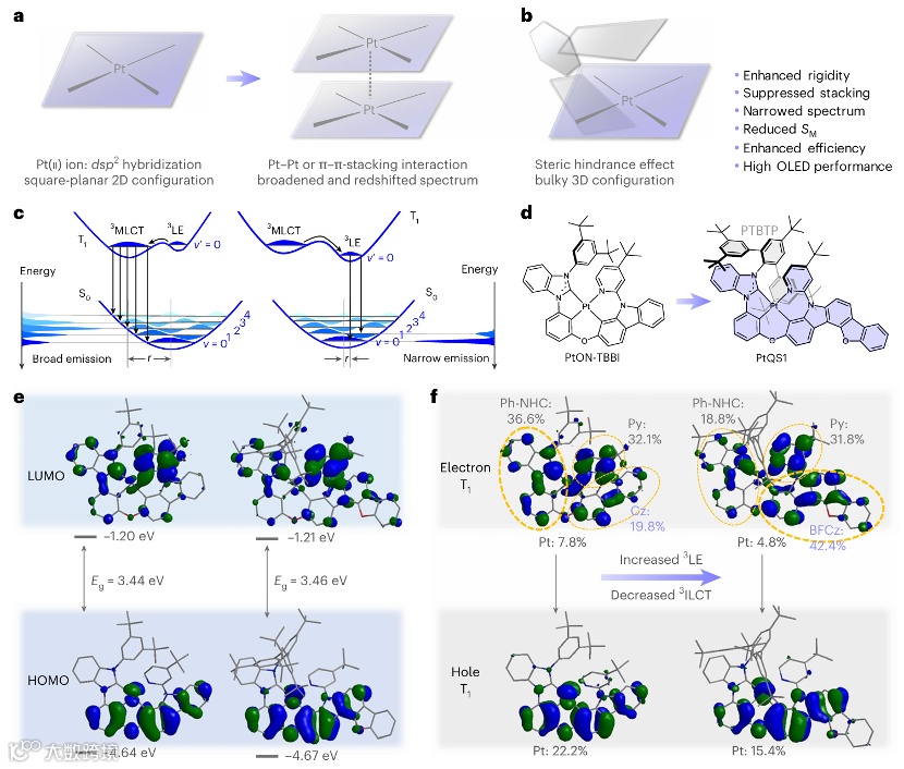 图1揭示了传统铂(II)配合物与新型PtQS1的结构差异及激发态调控机制。传统平面铂配合物(图1a)因dsp²杂化形成二维方平面构型,易发生Pt–Pt或π–π堆叠,导致光谱红移展宽。PtQS1(图1b)引入超大体积的五叔丁基三联苯(PTBTP)基团与苯并呋喃[3,2-c]咔唑(BFCz)扩展π共轭,形成三维刚性结构,有效抑制分子间作用。图1c通过势能曲线阐明激发态调控策略:将金属-配体电荷转移(MLCT)态能量略高于局域激发(LE)态,形成LE主导的混合激发态,既减少激发态几何变形(窄谱),又维持高效系间窜越(高量子效率)。图1e-f的轨道分析证实PtQS1的T₁态中³LE贡献达42.4%,远高于对照材料PtON-TBBI(19.8%),且分子内电荷转移(³ILCT)比例显著降低,从根源上抑制光谱展宽。