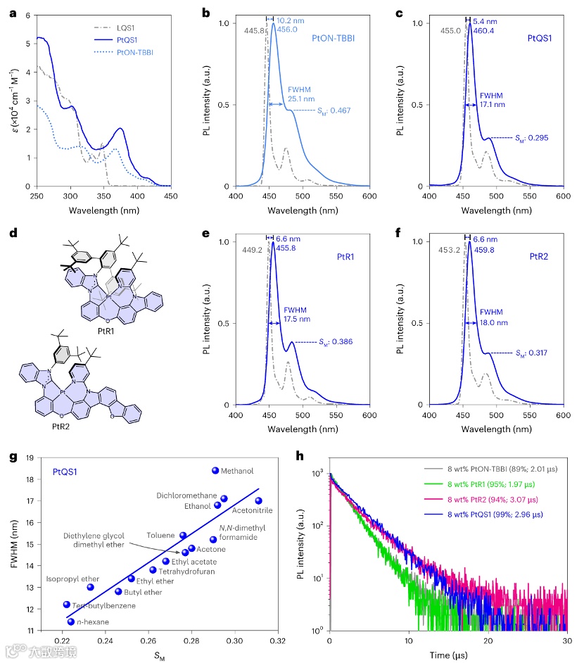 图3a-c对比了PtQS1与参照物PtON-TBBI的光学特性:PtQS1在室温二氯甲烷中发射峰460.4 nm,FWHM仅17.1 nm(图3c),显著低于PtON-TBBI的25.1 nm(图3b),且黄-里斯因子(Sₘ=0.295)更低,表明振动耦合减弱。图3d-f中简化结构分子PtR1/PtR2的FWHM(>17.5 nm)与Sₘ(>0.317)均劣于PtQS1,证明PTBTP位阻基团与BFCz共轭扩展的协同作用是窄谱关键。图3g显示PtQS1在不同溶剂中FWHM与Sₘ呈线性相关,证实其光谱稳定性。图3h中PtQS1掺杂薄膜的光致发光量子效率(PLQY)高达99%,且激发态寿命(2.96 μs)长于器件内实测值(2.43 μs),表明非辐射衰减被有效抑制。