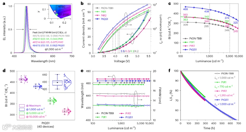顶发射器件(图5)实现进一步优化的色纯度:PtQS1的EL光谱FWHM压缩至13.1 nm,CIE*y*=0.062(图5b),接近超高清显示标准BT.2020(0.046)。其运行电压低至3.9 V@1000 cd m⁻²(图5c),蓝光指数(BI)峰值达468 cd A⁻¹ CIE*y*⁻¹,为商用荧光器件的两倍。图5f的寿命测试显示,PtQS1在初始亮度1000 cd m⁻²下半衰寿命(LT₅₀)长达670小时,刷新深蓝光OLED纪录。该稳定性归因于三维结构抑制分子降解、高激子利用率降低电流密度,以及水平偶极子取向提升光子提取效率。