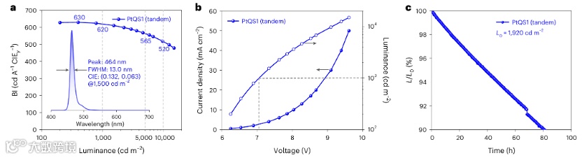 2.高效率与高稳定性并存:底发射器件在1000 cd m⁻²亮度下外量子效率(EQE)达30.8%,顶发射器件蓝光指数(BI)高达468 cd A⁻¹ CIE*y*⁻¹,且初始亮度1000 cd m⁻²下半衰寿命达670小时。