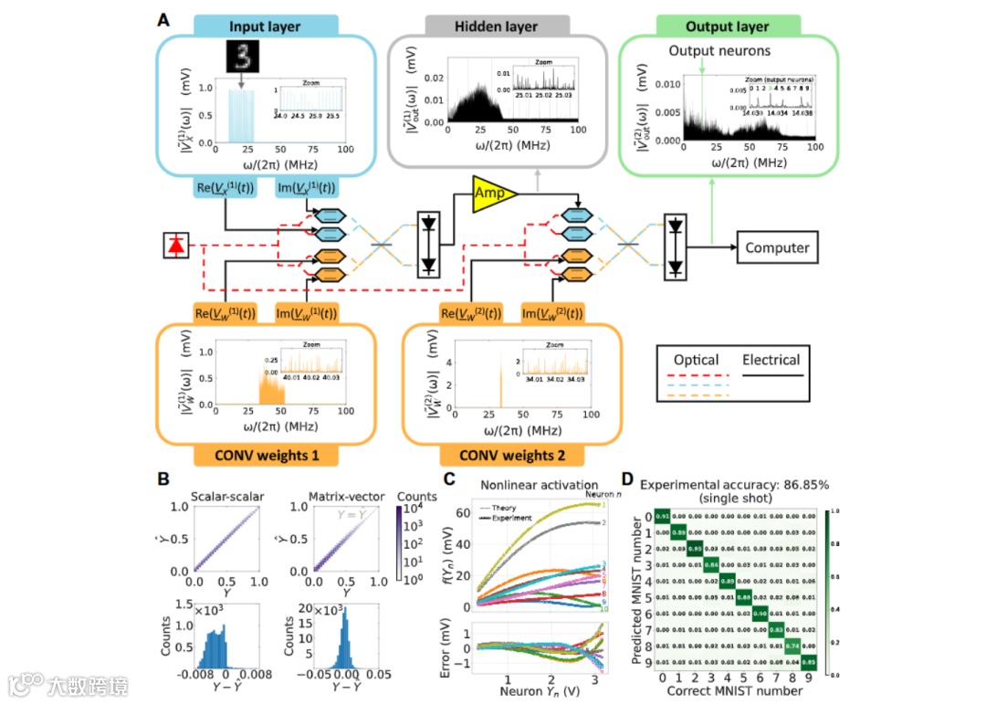 光系统凭借在光场中编码、路由和处理模拟信号的能力,展现出低噪声、高带宽和低能耗的优势,有望成为下一代人工智能硬件加速器的关键技术。光神经网络(ONN)方案通过光学组件的物理特性进行线性代数运算或在线非线性变换,但要充分发挥光子学的超低延迟和能耗优势,需同时实现线性和非线性操作,且尽可能减少系统开销,同时保持高硬件可扩展性和性能,这一直是该领域亟待解决的难题。在这样的背景下,研究团队提出了乘法模拟频率变换光神经网络(MAFT-ONN)架构,为解决上述问题带来了新的希望。
