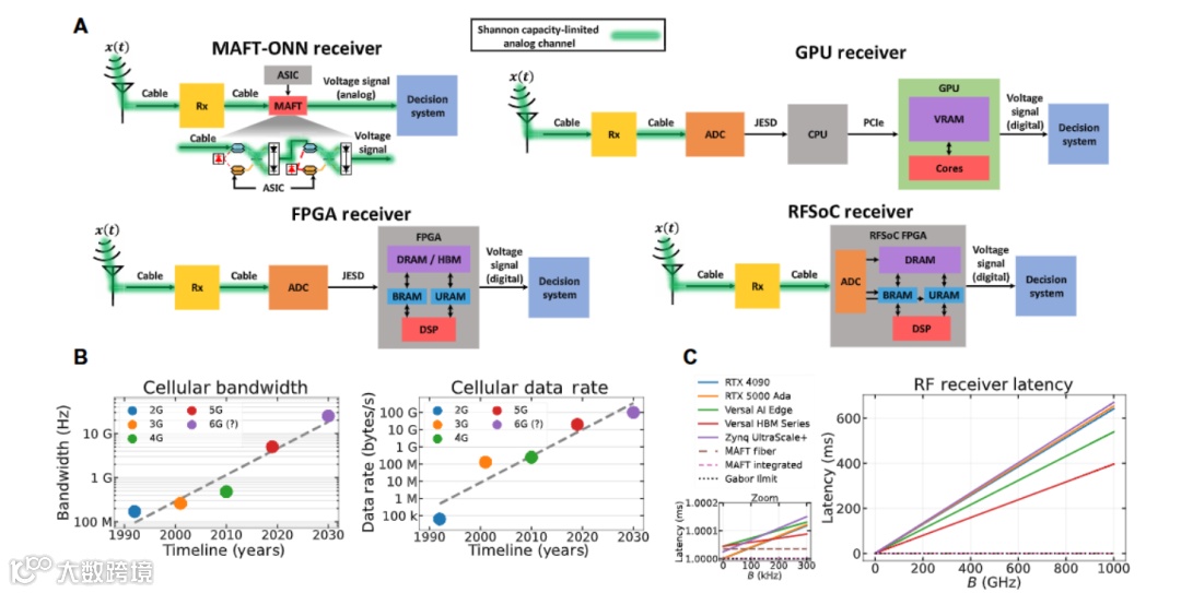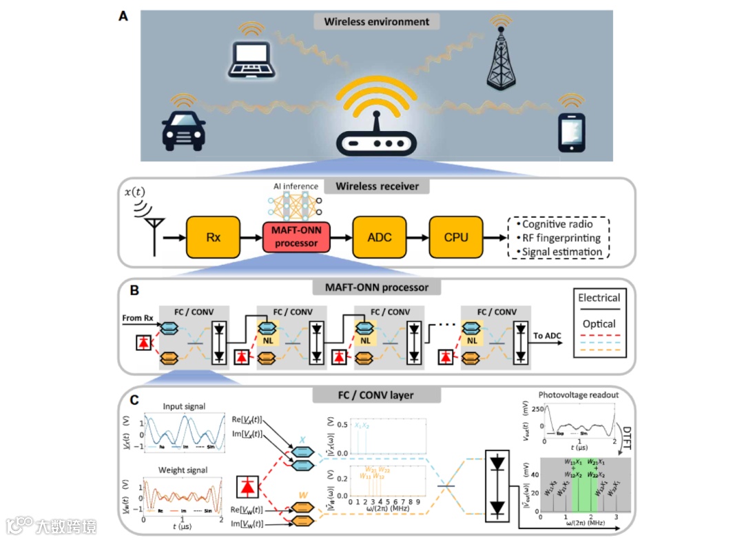 本文介绍了乘法模拟频率变换光神经网络(MAFT-ONN),这是首个无需数字化或预处理即可直接对原始射频信号执行推理的AI硬件加速器,可通过实验对原始射频(RF)信号进行全模拟深度学习计算。在调制分类任务中,其准确率可快速收敛至95%。MAFT-ONN还展现出良好的可扩展性,在MNIST数字分类任务中,能够完成近400万次全模拟运算。由于模拟数据移动受香农容量限制,MAFT-ONN的处理速度比传统射频接收器快数百倍。其延迟性能优于FPGA,同时兼具光学器件在成本、尺寸、重量及功耗方面的优势。此外,当充分利用光学带宽与空分复用时,该处理器的吞吐量可比肩其他最先进AI硬件加速器。未来工作将重点通过波分复用与空分复用技术进一步提升MAFT-ONN的规模。