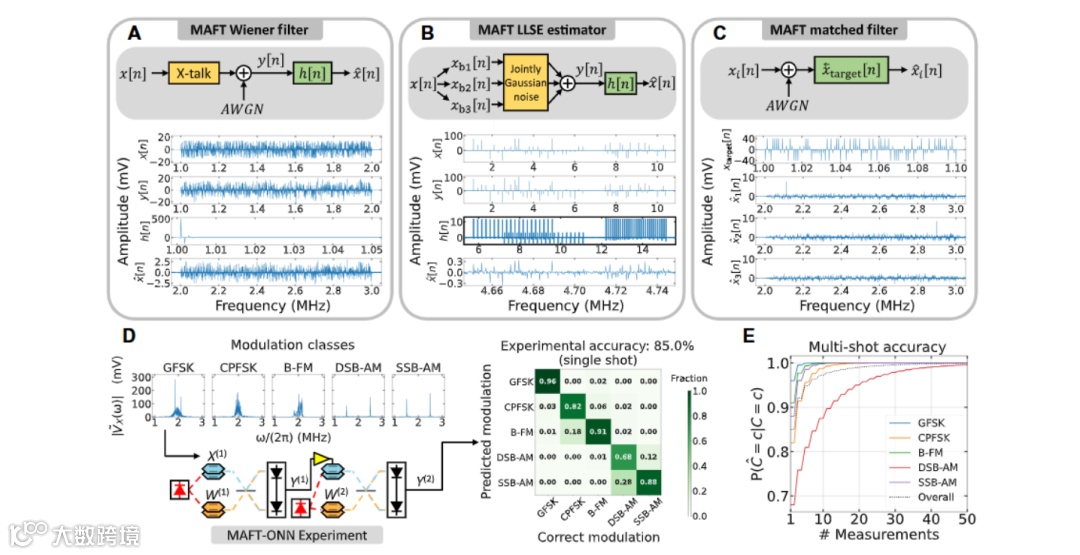 在处理实际信号时,MAFT-ONN的优势得以充分体现。以维纳滤波器为例,它可以对遭受频率串扰和加性高斯白噪声(AWGN)的信号进行恢复;线性最小二乘估计器(LLSE)则适用于处理非广义平稳(WSS)随机过程的信号,能够有效解决不同频率带具有不同编码和噪声特性的信号恢复问题;匹配滤波器功能更是强大,一次光电乘法就能实现对整个RF频谱的扫描,快速检测目标信号。这些技术的有机结合,使得MAFT-ONN在信号处理和深度学习任务中展现出强大的适应性和高效性。