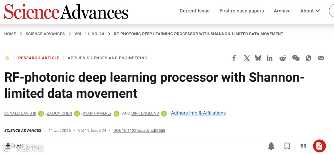埃德霍尔姆带宽定律预言了通信数据速率与频谱带宽将呈指数级增长。鉴于深度神经网络算力需求呈指数上升而摩尔定律日趋放缓,面向6G等未来先进通信系统亟需新型计算范式。光学神经网络(ONN)是极具潜力的加速器,但在可扩展性和系统开销方面面临挑战。6月11日,由麻省理工大学、南加州大学、NTT Resrarch组成的研究团队在Science Advances期刊发表题为「RF-photonic deep learning processor with Shannon-limited data movement」(具有香农极限数据移动能力的射频光子深度学习处理器)的研究论文。