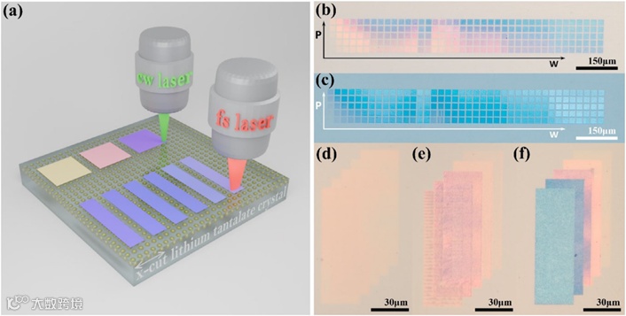 南开大学刘洪亮团队提出了一种在钽酸锂晶体表面构建稳定且颜色丰富的物理色彩结构方法。为了实现透明介质晶体表面色彩构建,研究人员通过离子注入技术在钽酸锂晶体表层注入金离子,在晶体表面形成具有特殊光学性质的改性层。随后利用532 nm连续波激光聚焦照射该区域,通过金纳米颗粒的局域表面等离子体共振效应(LSPR)激发特定波长的光散射与吸收,从而在晶体表面产生结构色。通过共聚焦拉曼光谱系统和高分辨率透射电子显微镜(HRTEM)与仿真计算探究着色机理,并且利用振镜加工系统完成了复杂图案的加工。该方法不仅具有较高的加工效率和可扩展性,还具有良好的稳定性和鲁棒性。该研究为透明介质晶体表面色彩构建提供了新的技术思路,有望在防伪、信息加密和艺术设计等领域得到广泛应用。相关工作以“Construction of Robust Physical Colors on Lithium Tantalate Crystals with Embedded Gold Nanoparticles and Laser Direct Writing”为题发表在《Laser & Photonics Reviews》期刊上。