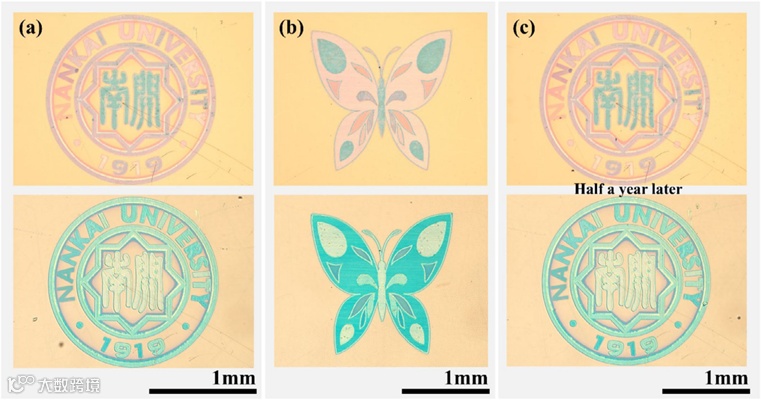 基于以上探究,研究人员利用激光直写技术在钽酸锂晶体表面加工了多种图案,包括南开大学校徽和卡通蝴蝶等,如图4所示。实验结果表明,由于纳米颗粒在晶体表层下稳定存在,因此这些图案具有良好的稳定性,耐摩擦,防潮,耐腐蚀。即使在水中或酒精中擦拭多次,颜色依然保持不变。此外,经过六个月的长期保存,图案的颜色未发生明显变化。