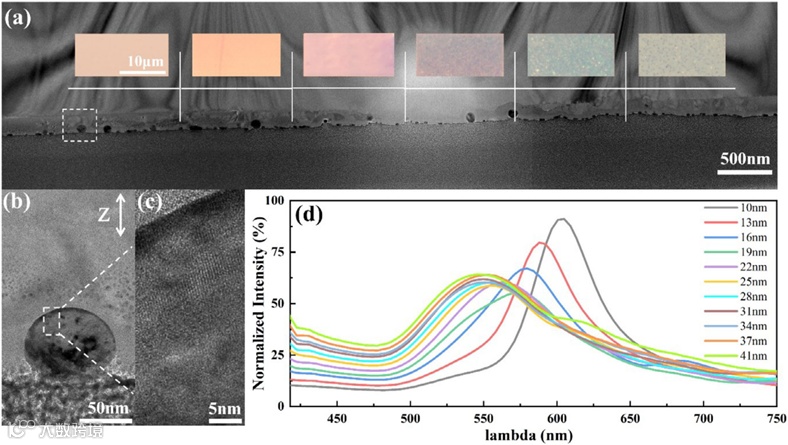 图3.a)金纳米颗粒组装区域的横截面高分辨透射电镜(HRTEM)图像。各色块插入的反射显微图像对应HRTEM图像中的不同区域。b)图3a中白色方框内大尺寸金纳米颗粒的横截面HRTEM图像。c)图3b中金纳米颗粒晶格条纹的部分示意图。d)通过调整大尺寸金纳米颗粒z轴半径进行相对反射光谱数值计算的结果。