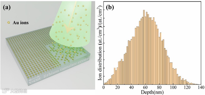 图1. a) 离子注入示意图; b) SRIM计算得出的Au离子分布。