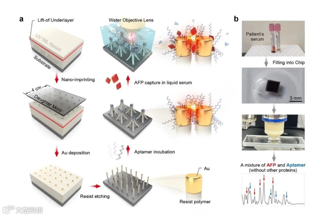 图 1. 基于纳米手指阵列结合DNA适配体剪纸技术形成的Au手指/适配体/Au手指芯片实现临床血清中生物标志物分子的SERS检测示意图。