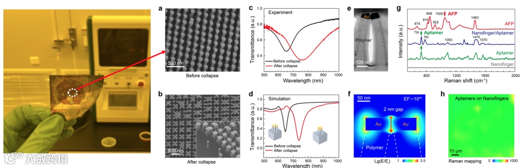图2为Au手指/适配体/Au手指耦合结构芯片的表征。有序纳米手指阵列(图2a)结合适配体孵化形成耦合结构(图2b),暗场光谱测量(图2c,d)及TEM截面分析(图2e)证实了耦合结构的形成。此时耦合光场增强达1000倍(图2f),使SERS增强达1011,满足单分子检测要求。针对检测可行性,首先对肝癌AFP标志物分子的纯品及对应适配体进行了拉曼表征,发现它们虽然有相同的拉曼振动峰,同时也有自己特有的指纹峰,因此,为后续通过双分子光谱进行目标分子检测提供了可行性(图2g)。另外,通过对芯片进行Mapping扫描,发现芯片的热点分布是非常均匀的(图2h)。