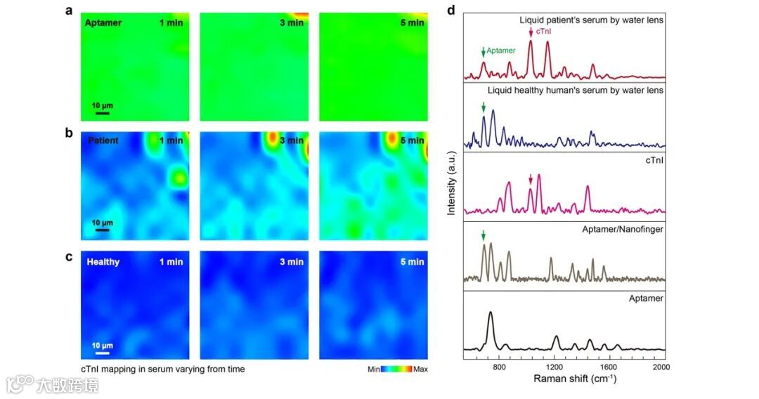 由于在液体血清中可以快速捕获到标志物分子到芯片表面,对测量时间比较敏感的疾病比较有优势。因此,本文利用芯片对急性心梗临床病人的血清进行了测量,这时,芯片中所使用的适配体只对急性心梗标志物肌钙蛋白 I(cTnI)敏感。结果表明,针对急性心梗病人血清,即使是1分钟间隔,也可以快速捕获到cTnI到芯片表面,完成指纹识别;而健康人血清中cTnI则非常弱(图5a-c)。最后,对拉曼Mapping中的指纹光谱进行分析,发现病人样本中只有cTnI和适配体的混合拉曼特征峰,而没有血清中其他分子信号的干扰(图5d)。