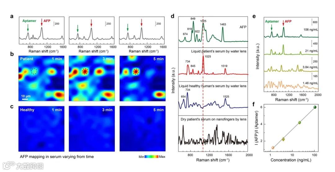 图4为基于Au手指/适配体/Au手指耦合结构芯片对临床肝癌(HCC)病人血清进行检测,使用的适配体只对标志物分子AFP特异性捕获。结果表明,在病人血清样本中只有AFP和适配体的拉曼指纹特征峰(图4d红线);而健康人血清中主要是适配体的拉曼特征指纹峰,虽然健康人中也含有少量AFP,由于捕获时间只有1分钟,几乎没有AFP被捕获(图4d蓝线)。但是,如果把病人血清直接滴到芯片上干燥后测量,得到的是多种分子的混合光谱,已经无法确定是否含有AFP(图4d黑线)。此外,通过时间分辨动力学Mapping扫描,发现即使1分钟间隔,也可以捕获到AFP;而健康人血清中即使经过5分钟,只发现非常微弱的AFP 信号(图4a-c)。最后,通过选择适配体作为内标分子,利用所有测量到的AFP平均值及适配体平均值建立了不同浓度AFP浓度曲线。因此,本方案可以对病人液体血清中的标志物分子进行特异性捕获及拉曼指纹识别,不会受其它分子干扰,由于采用内标分子,可降低光学等误差,最终实现精准检测。
