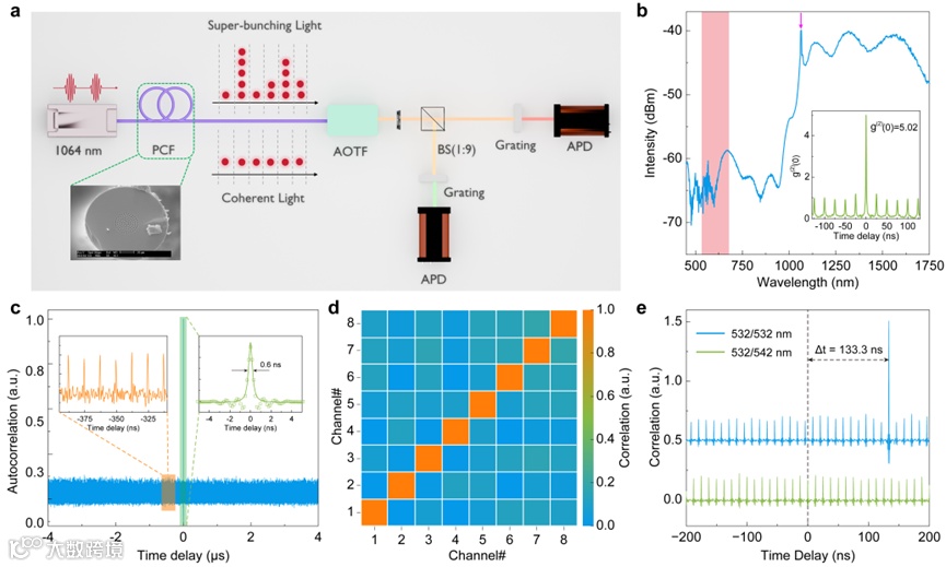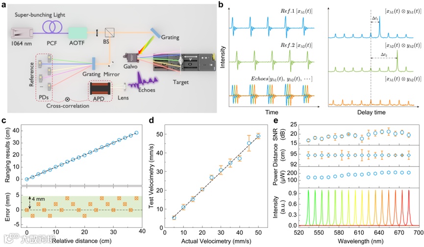 研究团队利用超聚束光不同波长之间天然准正交的特性,实现了无需复杂编解码的光谱编码通道划分,从源头解决并行LiDAR多通道的时频拥塞与串扰问题。实验中,超聚束光由超快脉冲激光器泵浦光子晶体光纤产生,光谱覆盖480-1750 nm,为大规模多通道提供了基础;在相关性测量中验证:同波长通道存在极值相关峰,不同波长通道几乎无相关峰,表明通道间串扰可忽略,而且这一特性使系统突破了传统的脉冲TOF-LiDAR测量距离限制。