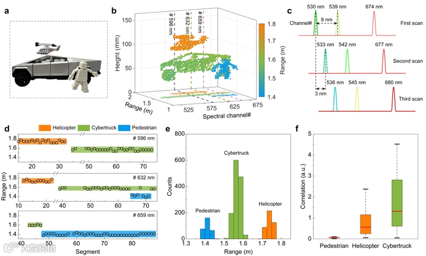 在3D成像演示中,系统利用51个光谱通道与88个垂直扫描段实现51×88像素的高分辨3D重建,单扫描段积分时间同样为10 μs,可恢复更细的目标细节。除此之外,该系统还能利用回波相关强度的统计特征做目标区分/识别:不同目标因反射率与表面性质不同,相关系数分布呈现显著差异——例如行人衣物反射率较低导致相关系数整体偏小,而金属质感更强、表面更光滑的目标相关更强,体现出“相关特征+机器学习”走向智能识别的潜力。